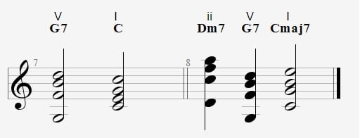 This second example illustrate chord addition. In the second bar, a Dm7 (ii chord) is added on the first beat, and the G7 (V chord) is compressed into a single beat. The Dm7 (ii chord) is derived from the G7 (V chord) using a simple rule.